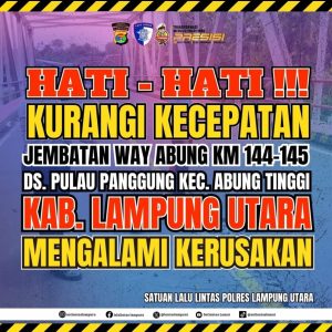 Lampung Utara (Globalasia 48 co id) – Sat Lantas Polres Lampung Utara menghimbau masyarakat khususnya penguna kendaraan roda empat dan dua diminta untuk berhati-hati saat melintasi Jembatan Way Abung KM 144-145 Jalan Lintas Sumatera di Desa Pulau Panggung, Kecamatan Abung Tinggi, daerah itu kondisi rusak nyaris amblas.