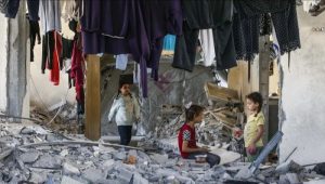 Caption Foto: Anak-anak Palestina dibawah puing-puing rumah yang hancur  akibat serang. Tentara Israel di Jalur Gaza. Foto/Xinhua