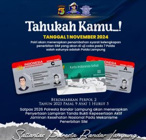 “Dengan ini, Satpas (Satuan Penyelenggaraan Administrasi SIM) Polres dan Polresta jajaran di Polda Lampung, akan menerapkan penyertaan lampiran tanda bukti kepesertaan aktif BPJS Kesehatan pada setiap mekanisme penerbitan SIM,” ujarnya.