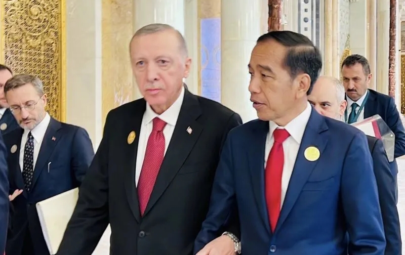 Presiden RI Joko Widodo dan Presiden Turki Racep Tayyip Erdogan saat menghadiri KTT luar biasa OKI di King Abdulaziz KAICC Riyadh Arabsaudi, Sabtu (11/11/2023). Dok/Antara