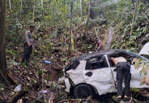 Pesisir Barat – Sebuah mobil Toyota Rush warna putih korban lakalantas akibat masuk jurang sedalam 50 meter di Hutan Kawasan (Tebing Batu) Lintas Barat, Pekon (Desa, red), Rata Agung, Kecamatan Lemong, Kabupaten Pesisir Barat, Lampung, Jum’at (5/4/2024), sekitar pukul 16.00.