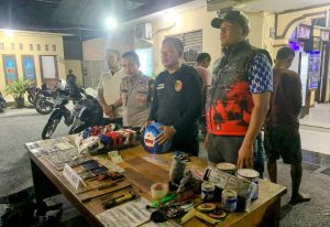“Dari penggerebekan ini, kami menyita tujuh motor, 13 plat TNKB motor, satu plat TNKB mobil, serta alat-alat pemalsuan seperti pahat, gerinda, dan cat besi,” terang Kompol Rohmawan.