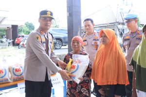 Caption Foto: Kapolres Lampung Utara berikan batuan sosial (Bansos) sembako kepada masyarakat sekitar Mapolres setempat. Dok Foto/HAR