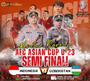 Lampung Utara (Globalasia 48 co.id) – Polres Lampung Utara menggelar nonton bareng (Nobar) pertandingan semifinal AFC Piala Asia U23 antara Timnas Indonesia melawan Uzbekistan di Joglo Kantor Mapolres setempat, Senin 29 April 2024 malam ini.