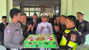 Kue ulta HUT TNI itu, bertuliskan “Dirgahayu TNI ke-80 diberikan oleh Kapolres Tanggamus AKBP Rahmad Sujatmiko, SIK, MH kepada Komandan Kodim 0424 yang disaksikan oleh jajaran Forkopimda Kabupaten Tanggamus.