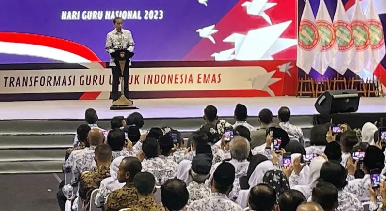 Presiden Joko Widodo sampaikan sambutan dalam peringatkan HUT ke-78 PGRI dan Hari Guru Nasional Tahun 2023 di Jakarta, Sabtu (25/11/2023). Dok/Antara