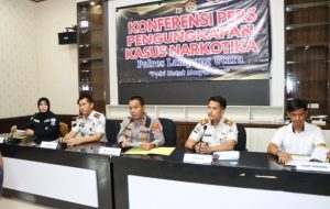 Kapolres Lampung Utara AKBP Deddy Kurniawan diwakili Waka Polres Kompol Yohanis didampingi Kasat Resnarkoba AKP A. Mardiansyah Putra dan Karutan Kelas IIB Kotabumi Marthen Butar Butar serta Kalapas Kelas IIA Kotabumi Tomi Elyus dalam keterangan Pers Rilis di Ruangan Rekomfu, Rabu (15/4/2026), membenarkan adanya dugaan penyeludupan barang terlarang narkoba jenis sabu-sabu kedalam Lembaga Permasyarakatan (LP) yang melibatkan seorang warga binaan dan oknum pegawai Rutan Kelas II B Kotabumi.