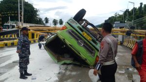 “Jalan yang menurun menyebabkan truk melaju dengan kecepatan tinggi hingga menghantam tiang pembatas tinggi kendaraan di areal pelabuhan tersebut,”terang sopir.(GA/HAR)